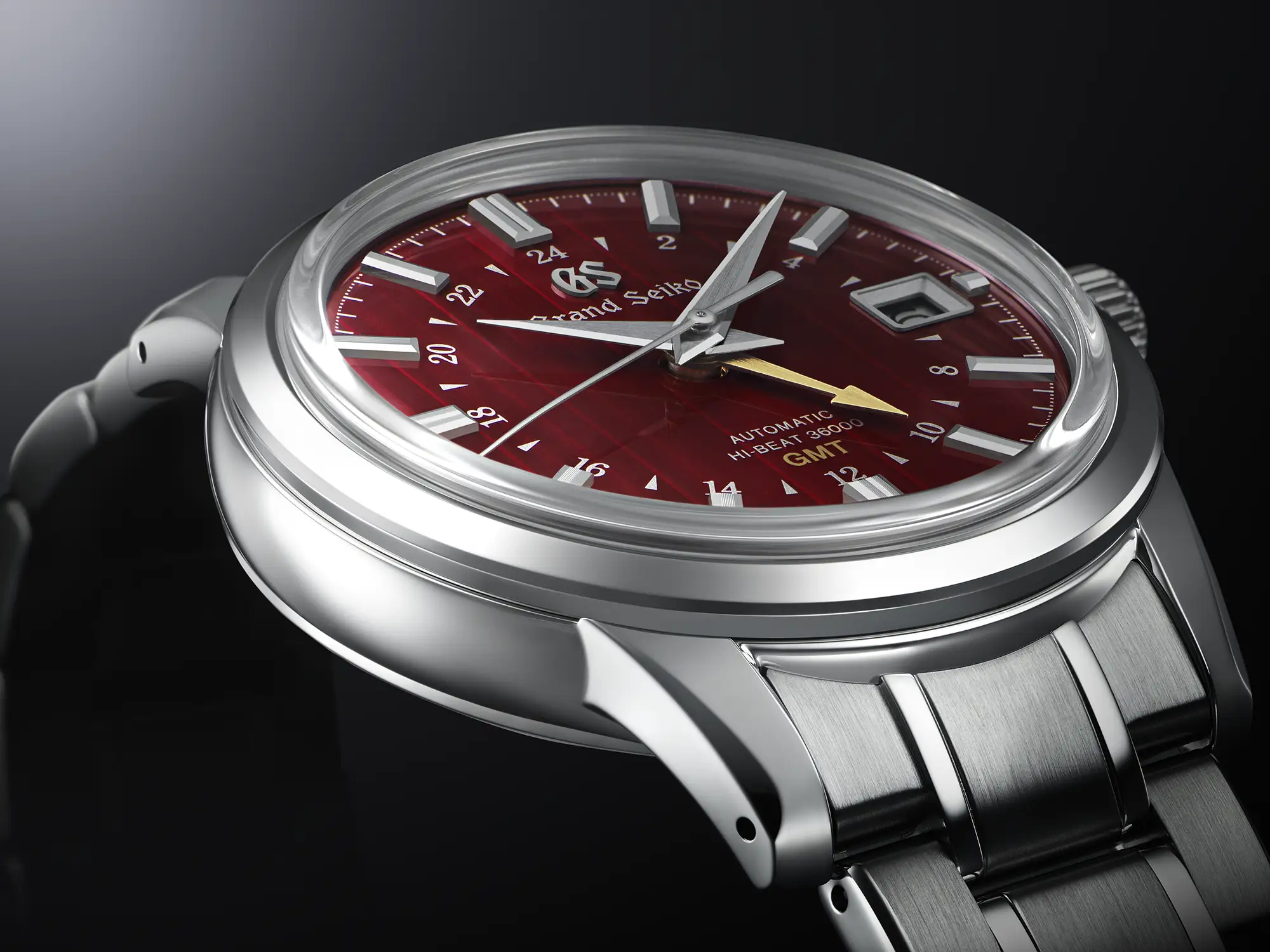 With a stripe pattern polished to a bright sheen, the dial of SBGJ273 shows a rich range of red colors, reflecting the subtle variations among the fiery leaves and the dark reflective floorboards themselves, expressing yuka momiji. The depth and complexity of the dial are complemented by the GMT hand, which takes on a vivid gold color that adds to the feeling of autumn while ensuring high contrast and easy legibility. This combination of beauty and ease of use continues with the diamond-cut hands and indexes, which reflect light pleasingly while ensuring that the watch can be read even in low light and without the use of luminous material. Like all Grand Seiko GMT watches, this new timepiece has an independent local hour hand, allowing the time to be changed easily, forward or back, as one goes about their travels.
